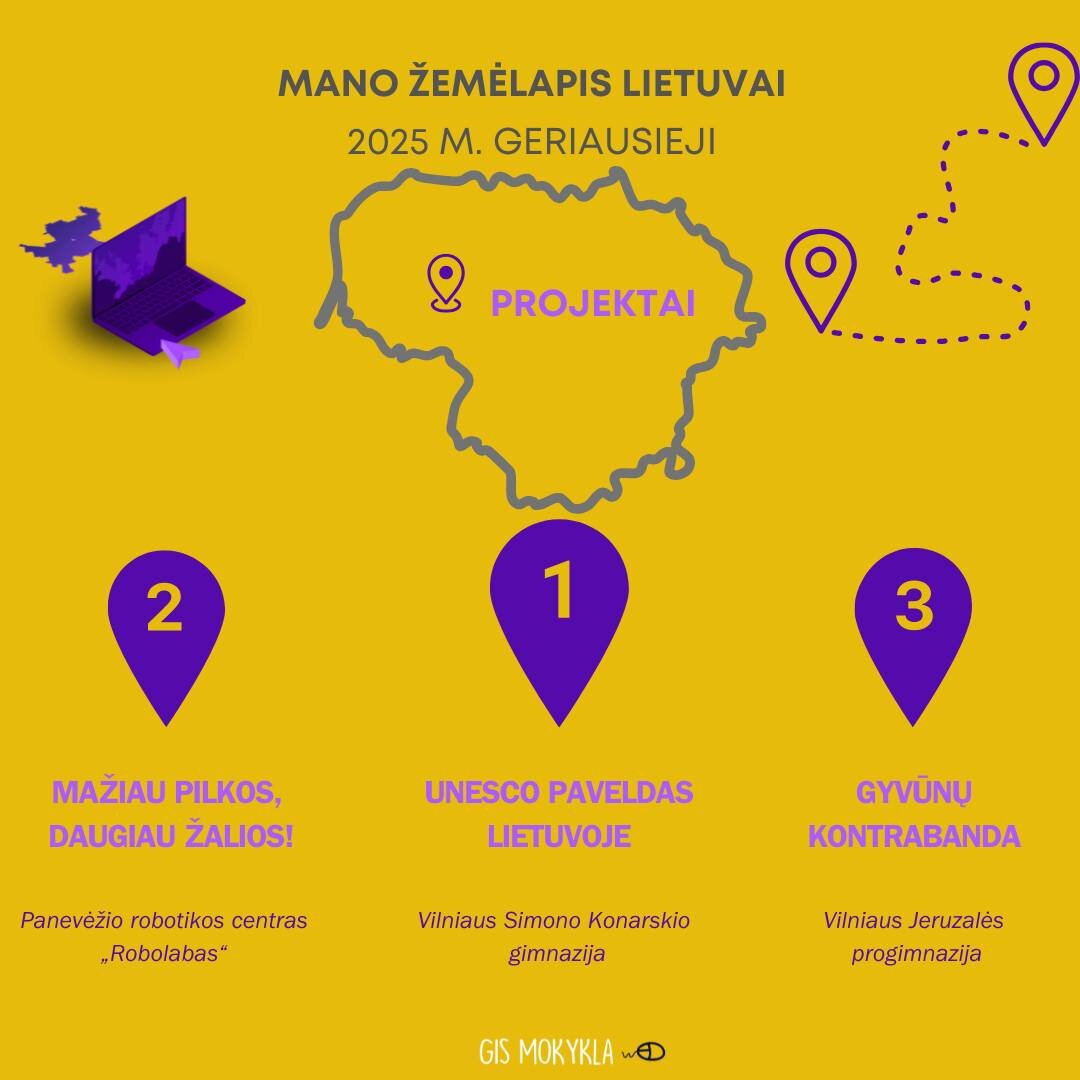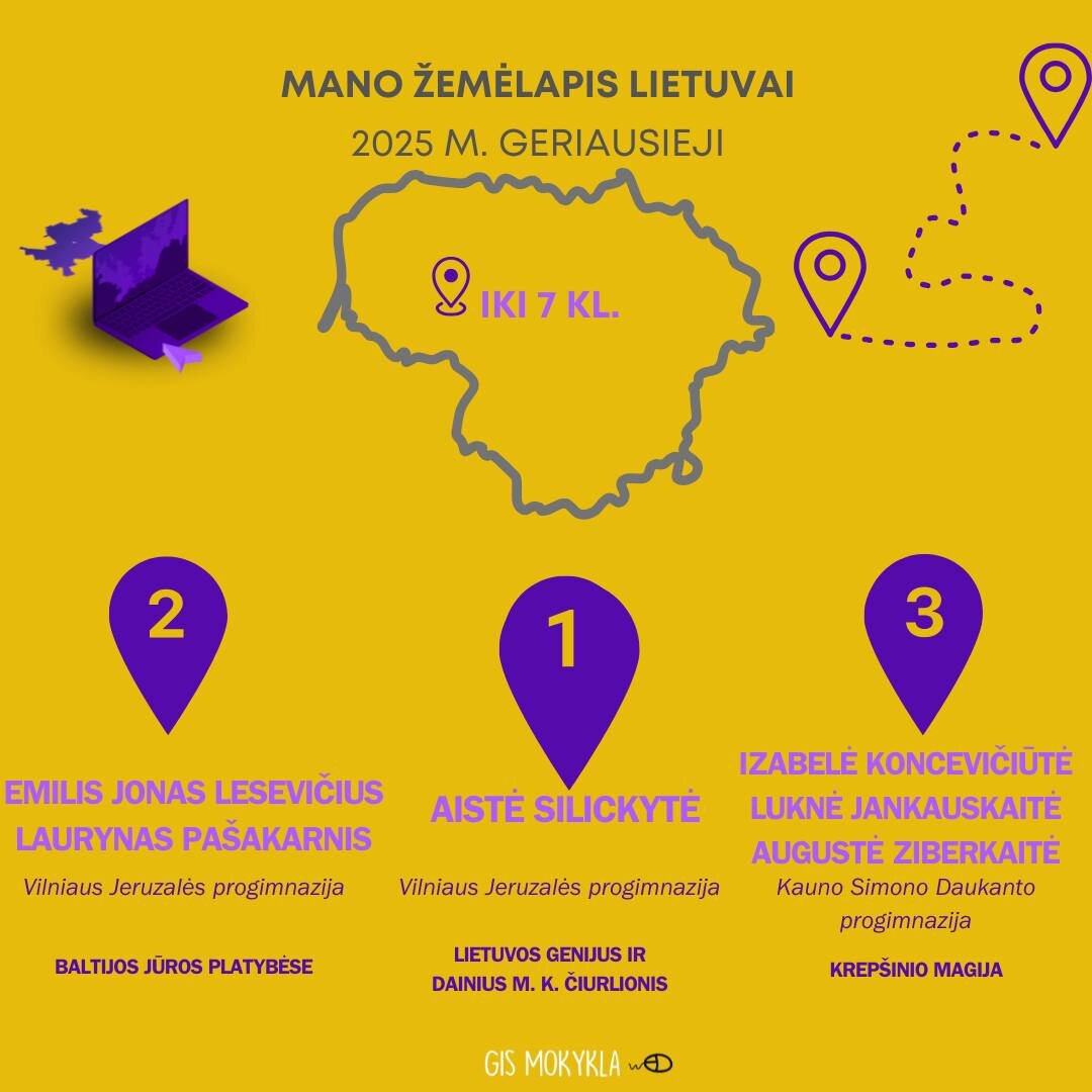 MANO ŽEMĖLAPIS LIETUVAI 2025 M. GERIAUSIEJI: Kategorijoje iki 7 kl. - I vietos nugalėtoja Aistė Silickytė (6b kl.),mokyt. Aurelija Kuckaitė su darbu: Lietuvos genijus ir dainius M. K. Čiurlionis: https://arcg.is/14PODK4