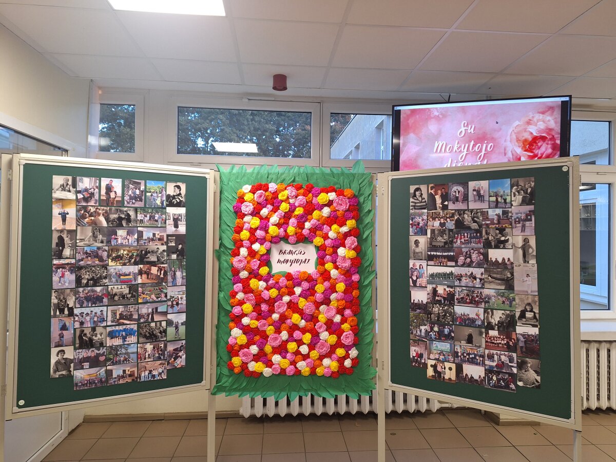 Pirmojo aukšto erdvėje mokytojus pasitiko Dailės mokytojos Renatos Vičinienės ir mokinių sukurta gėlių dekoracija bei nuotraukų ekspozicija. Joje – mokytojų akimirkos ir prisiminimai iš šiandien bei ankstesnių darbo metų, leidžiantys pažvelgti į bendruomenės istoriją.