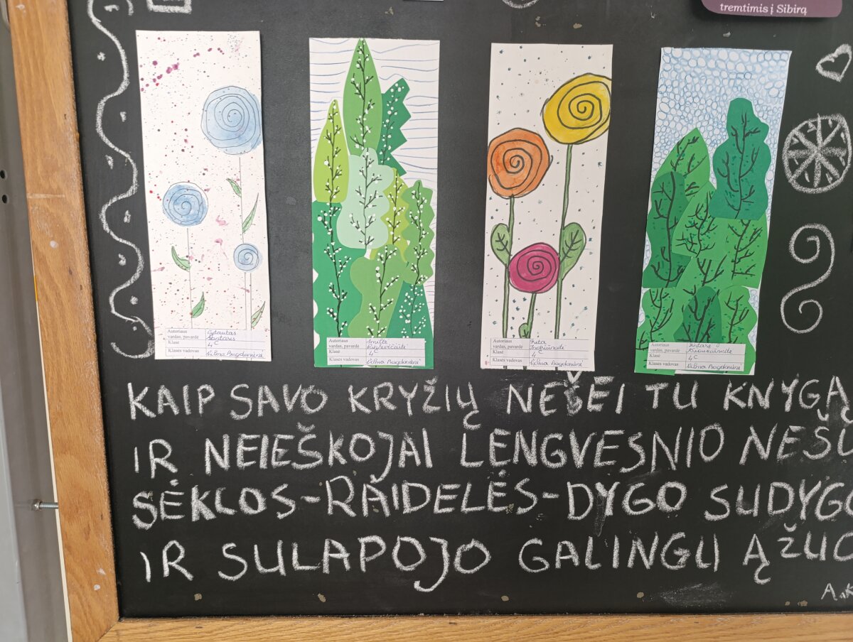 Antrame mokyklos aukšte eksponuojami įvairiomis technikomis kurti 1–4 klasių mokinių knygų skirtukai, puošti augaliniais ir tautiniais motyvais, gražiausių austinių juostų raštais ir švelnučiais vaikų rankų darbo kutais, kruopščiai nupiešti, aplikuoti, suverti ir surišti.